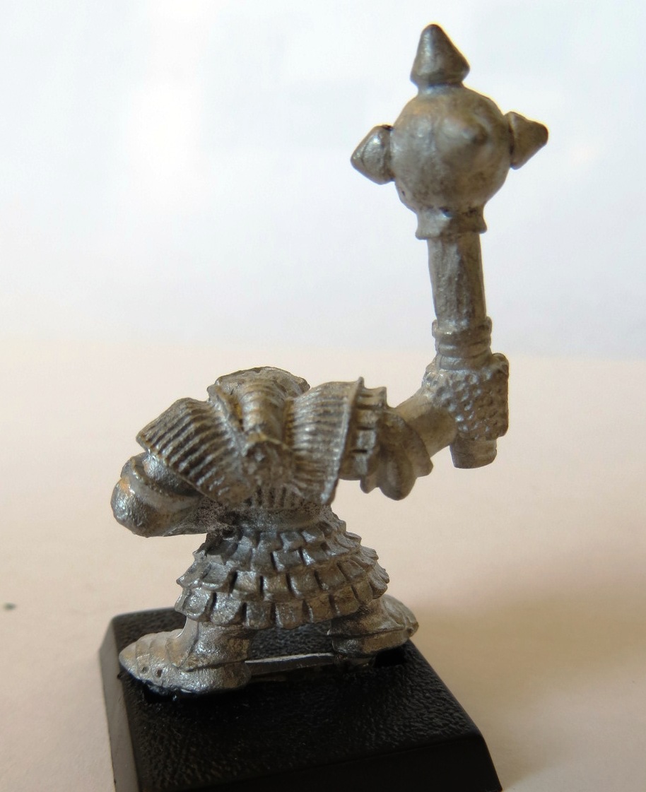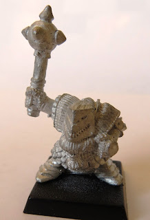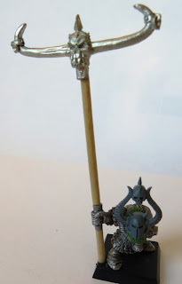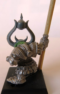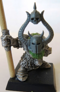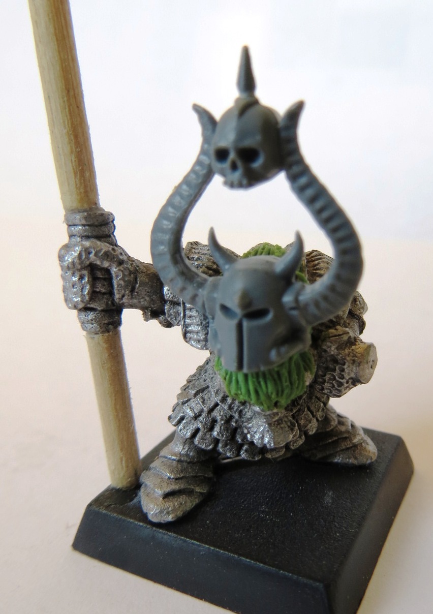 Nain du chaos marauder que j'ai modifier pour en faire un porte etendard car malheureusement cela n'existais pas dans cette armee ( qui n'en etait pas encore une ) a cette epoque chez citadel ( games workshop ) et hors de question d'inclure un seul nain avec leurs barbes en bigoudi et leurs casques de 2 m de haut ( certainement les figs les plus moches des annees 90 chez games workshop ) bref !!!