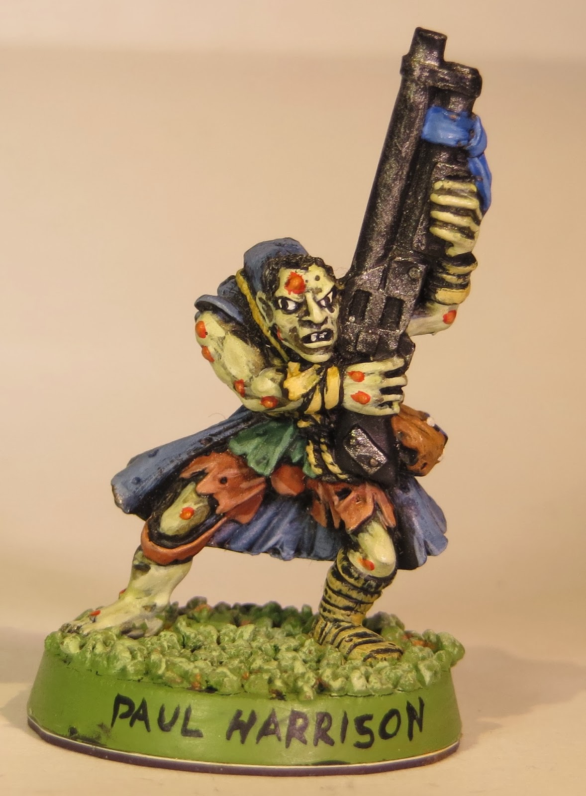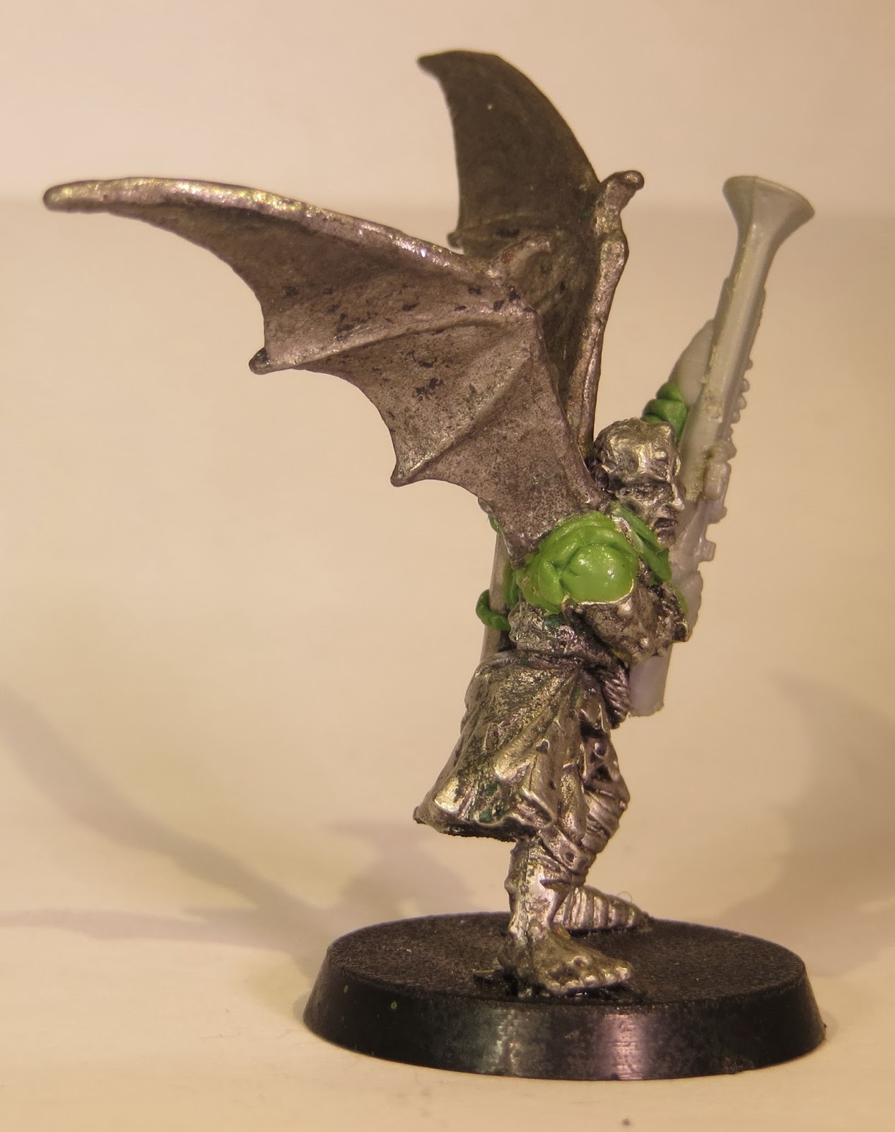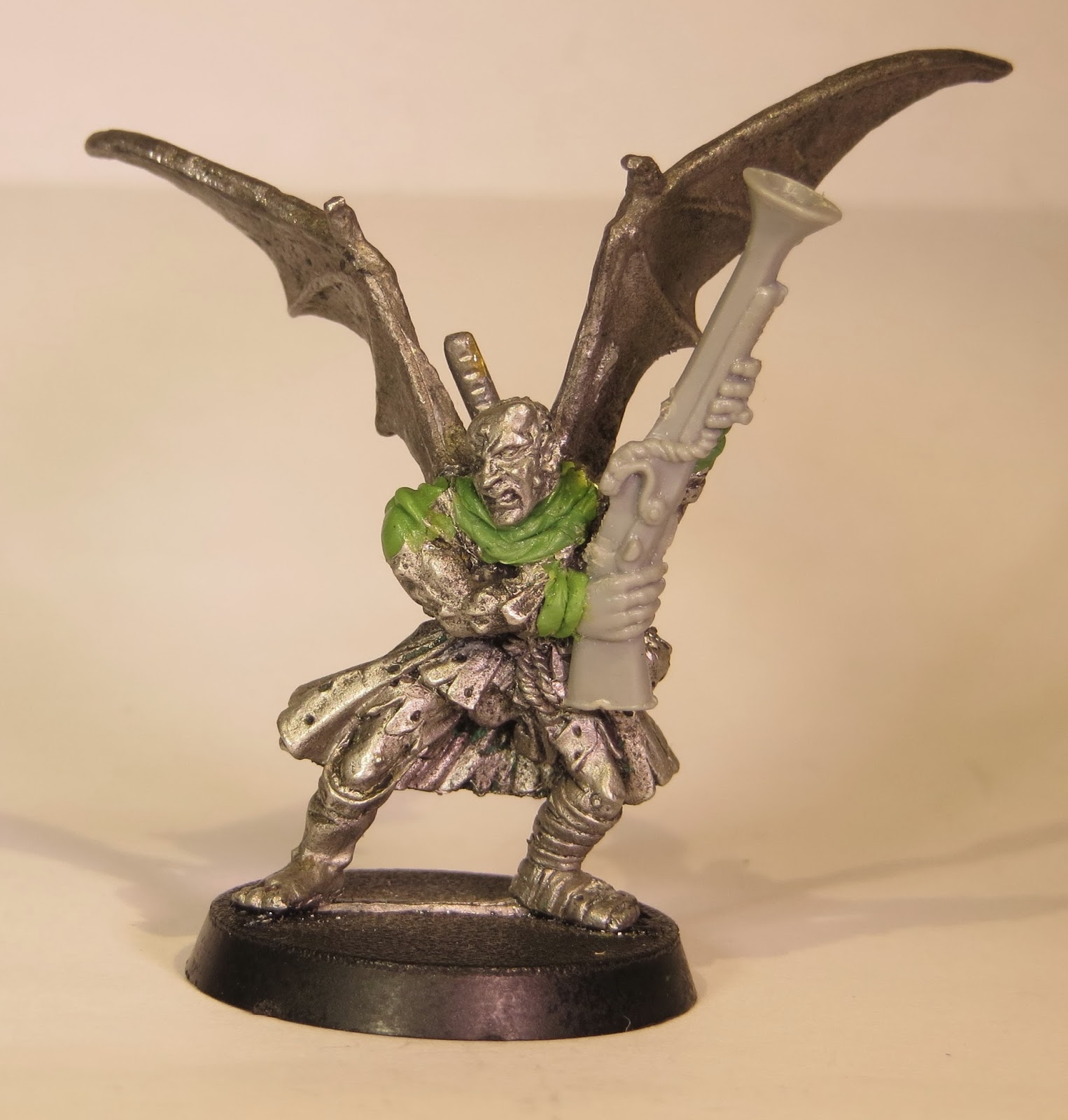 Figurine games workshop de Ganger fouisseur Necromunda dont j'ai remplace le fusil part un tromblon plastique des grappes Mordheim ou de l'empire, la tete est celle d'un autre ganger que j'ai decapite dans un autre article sinon les ailes proviennent d'une vielle figurine preslota inconnu et le sabre ???? aucune idee